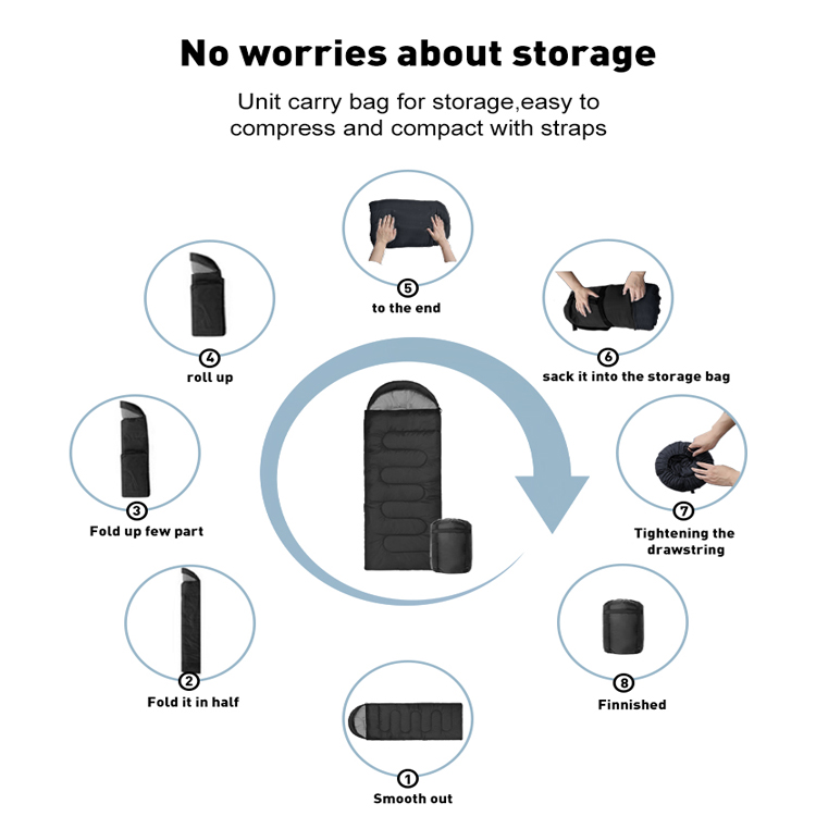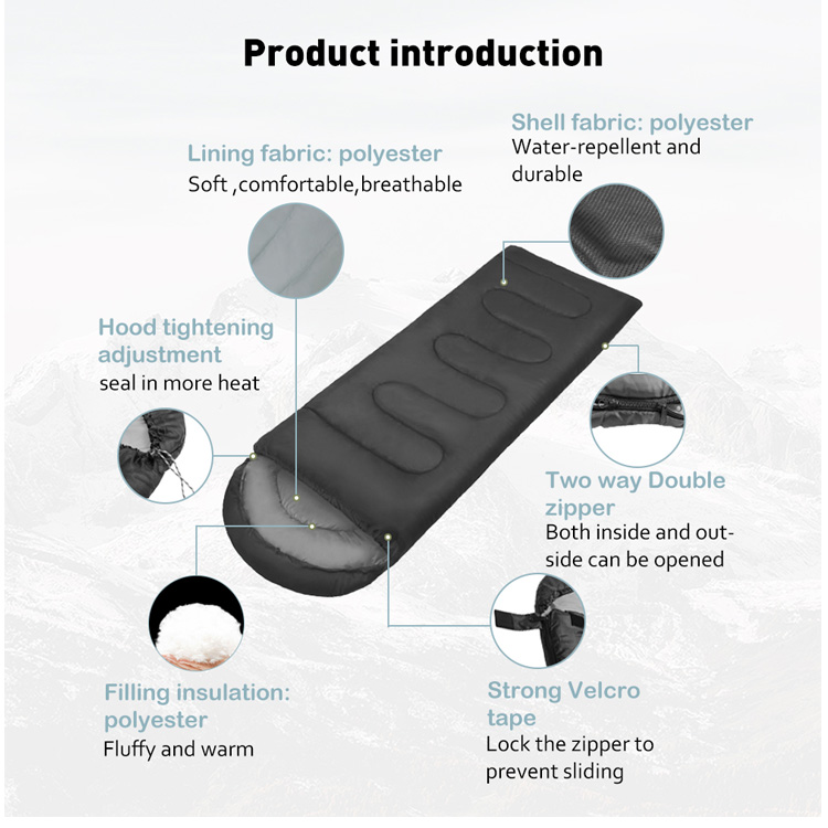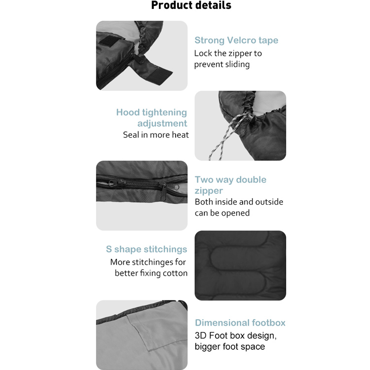 विशाल लिफ़ाफ़ा-शैली का आकार पर्याप्त लेगरूम प्रदान करता है और नींद के दौरान आरामदायक गति की अनुमति देता है, जबकि एर्गोनोमिक हुड डिज़ाइन सिर और कंधों के आसपास बेहतर गर्मी प्रतिधारण प्रदान करता है।