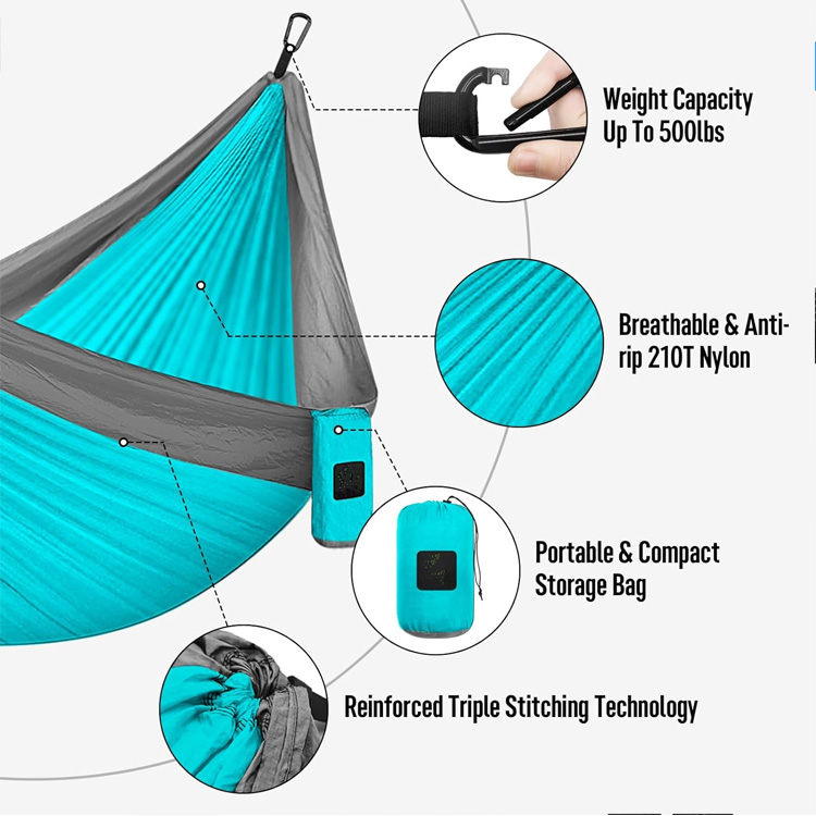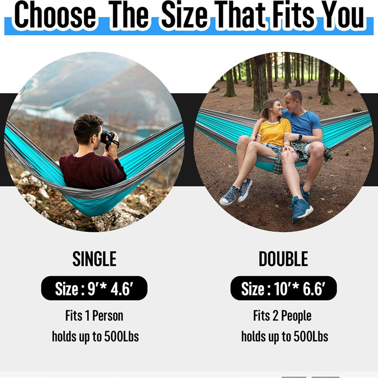 कैम्पिंग हैमॉक डबल और सिंगल पोर्टेबल हैमॉक। आउटडोर एडवेंचर्स के लिए आपका अंतिम बहुमुखी विश्राम प्रणाली। यह कैम्पिंग झूला अपने अनुकूली डिज़ाइन के साथ दोहरे और एकल दोनों उपयोगकर्ताओं को समायोजित करता है। पेशेवर वृक्ष पट्टियों से परिपूर्ण, यह हल्का नायलॉन पैराशूट झूला अधिकतम आराम और पोर्टेबिलिटी प्रदान करता है।