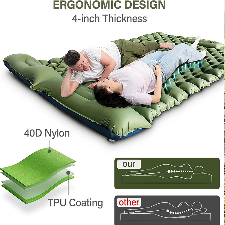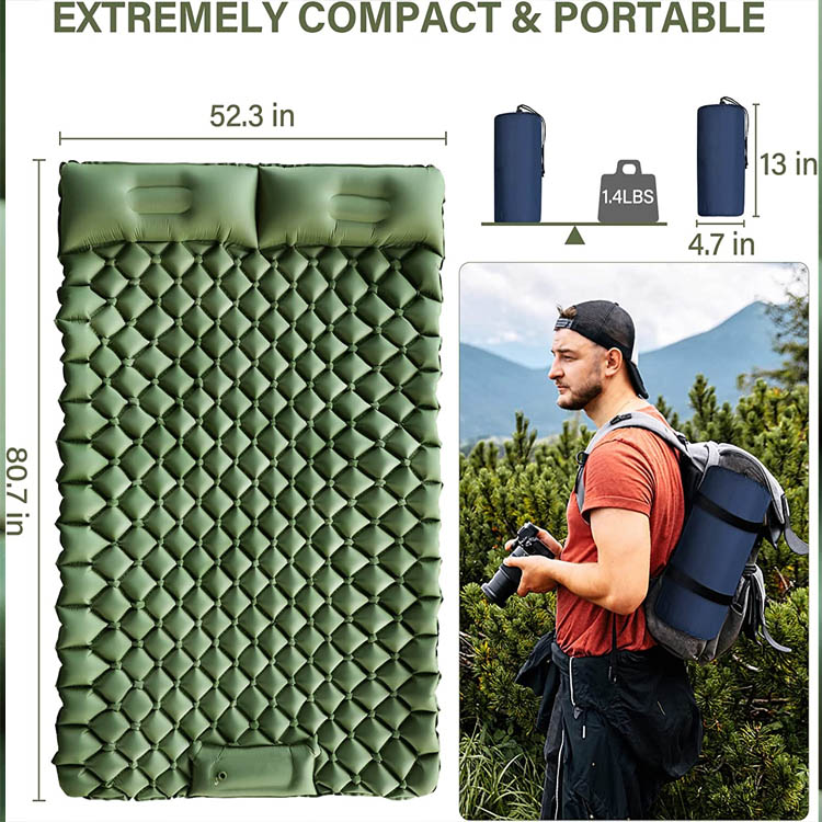 डबल-पर्सन कैम्पिंग स्लीपिंग पैड इन्फ्लेटेबल कैम्पिंग पैड। आउटडोर एडवेंचर्स के लिए अंतिम डबल आराम। यह इन्फ्लेटेबल दो-व्यक्ति कैम्पिंग पैड फिसलने से रोकने के लिए एक अभिनव पैर-प्रतिरोधक डिजाइन के साथ विशाल सोने की जगह प्रदान करता है। एक अल्ट्रा-लाइटवेट समाधान के रूप में, यह कैम्पिंग करने वाले जोड़ों और दोस्तों के लिए बेजोड़ पोर्टेबिलिटी और साझा आराम प्रदान करता है।