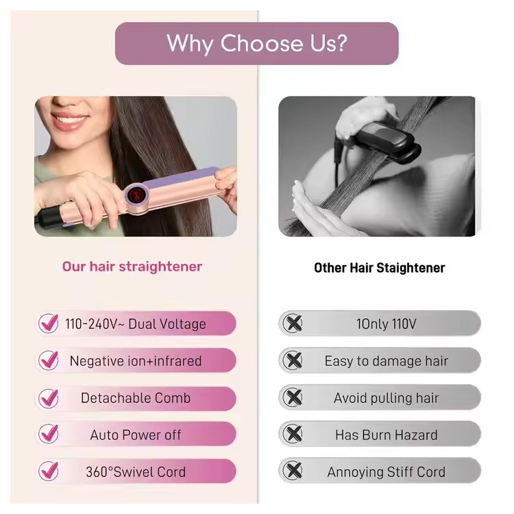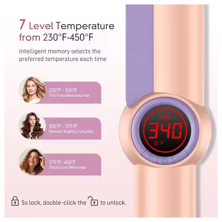 पतले, मध्यम या मोटे बालों के अनुरूप अनुकूलन योग्य हीट सेटिंग्स की सुविधा। चाहे आप स्ट्रेटनिंग कर रहे हों, कर्लिंग कर रहे हों, या लहरा रहे हों, आप गर्मी से होने वाले नुकसान के जोखिम के बिना कुशलतापूर्वक स्टाइल करने के लिए आदर्श तापमान का चयन कर सकते हैं।