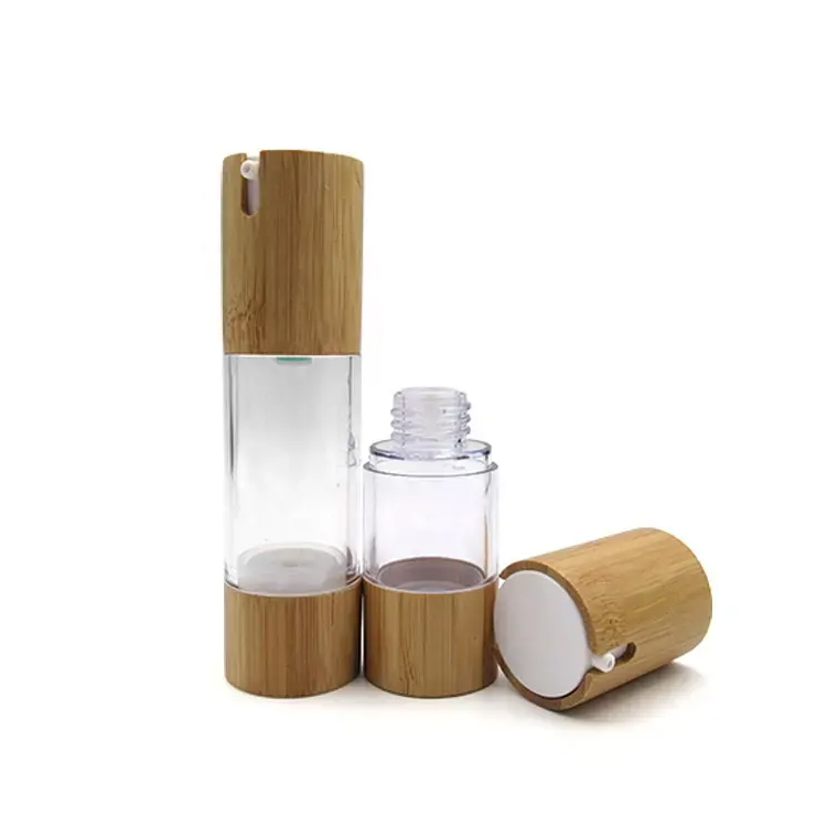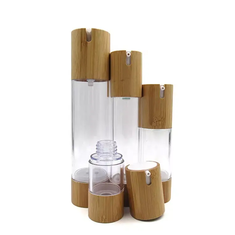 नेचर बांस प्लास्टिक डिस्पेंसर लोशन पंप एयरलेस बॉटल। नेचर बांस लिड्स 15ml, 30ml, 50ml, और 100ml एयरलेस प्लास्टिक डिस्पेंसर की बोतलों में एक चिकना बांस पंप की सुविधा होती है, जो आसान-टू-क्रीम, क्रीम, और अन्य कॉस्मेटिक उत्पादों के लिए एक इको-फ्रेंडली, स्टाइलिश और व्यावहारिक समाधान प्रदान करता है।