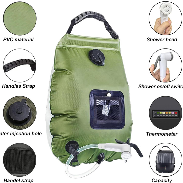 सौर पोर्टेबल शावर कैम्पिंग हीटिंग कैम्पिंग शावर बैग। आउटडोर एडवेंचर के लिए आपका अंतिम पोर्टेबल स्वच्छता समाधान। यह सोलर शावर बैग कैम्पिंग आराम के लिए 5 गैलन/20 लीटर हीटिंग पानी प्रदान करता है। सौर ऊर्जा का उपयोग करते हुए, यह जंगल में कहीं भी एक गर्म, ताज़ा शॉवर अनुभव सुनिश्चित करता है।